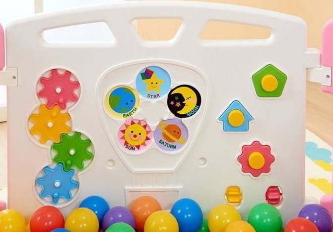 ~~輕鬆組裝、雙重安全防護門鎖、多款組合方式,可依調整圍欄為長型或六角型、多款遊戲,訓練寶寶學習獨立成長、活動 。